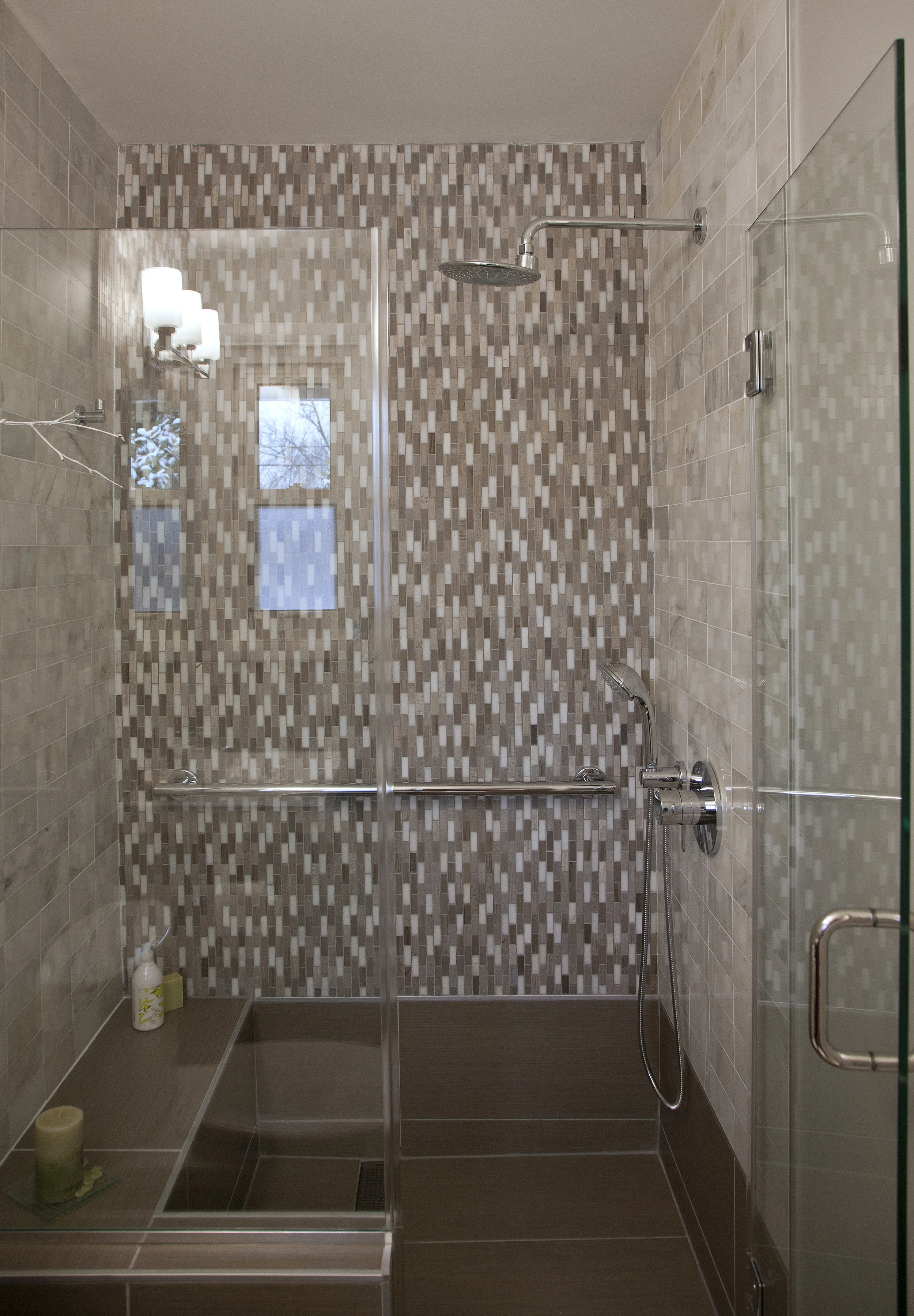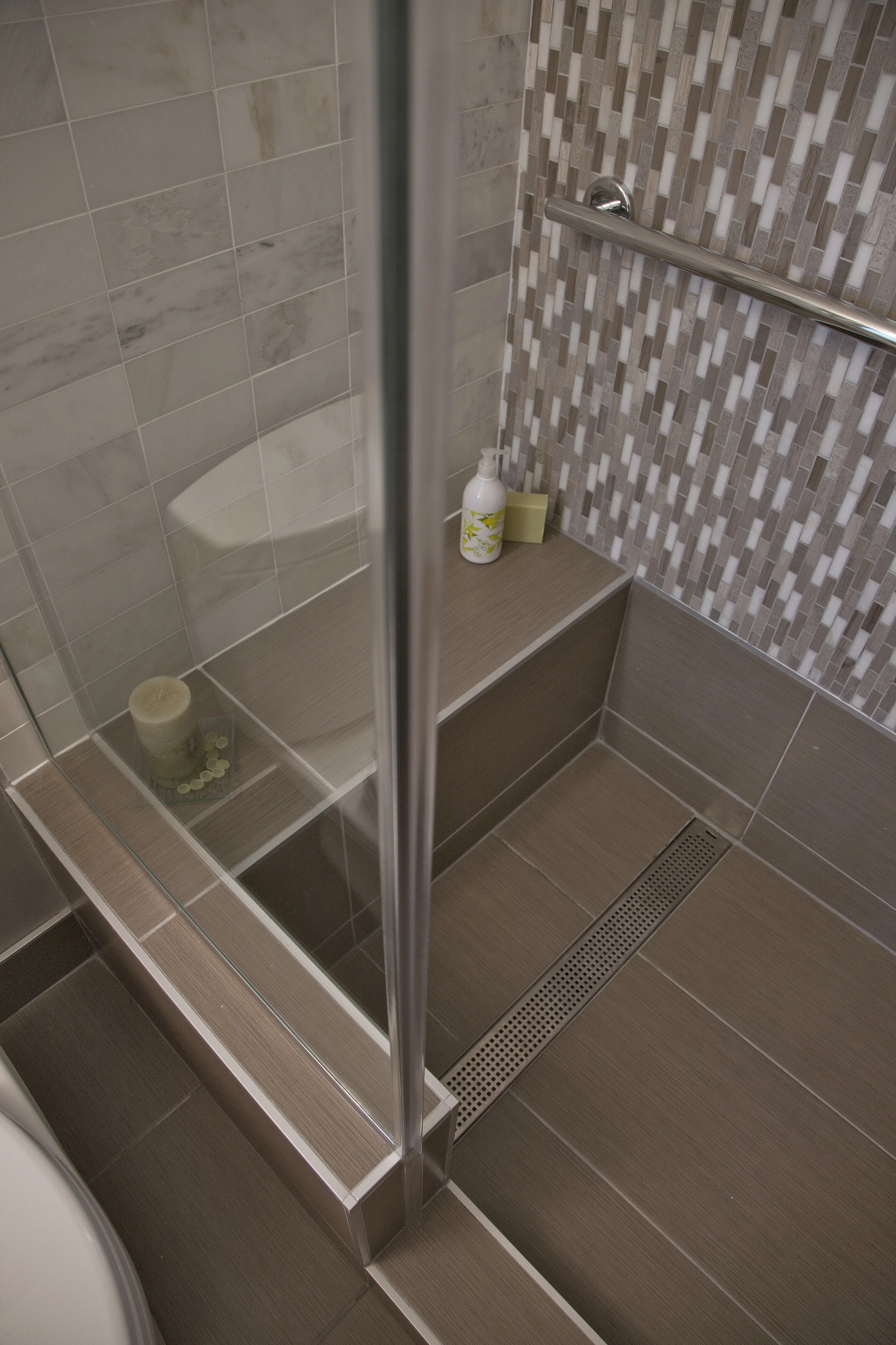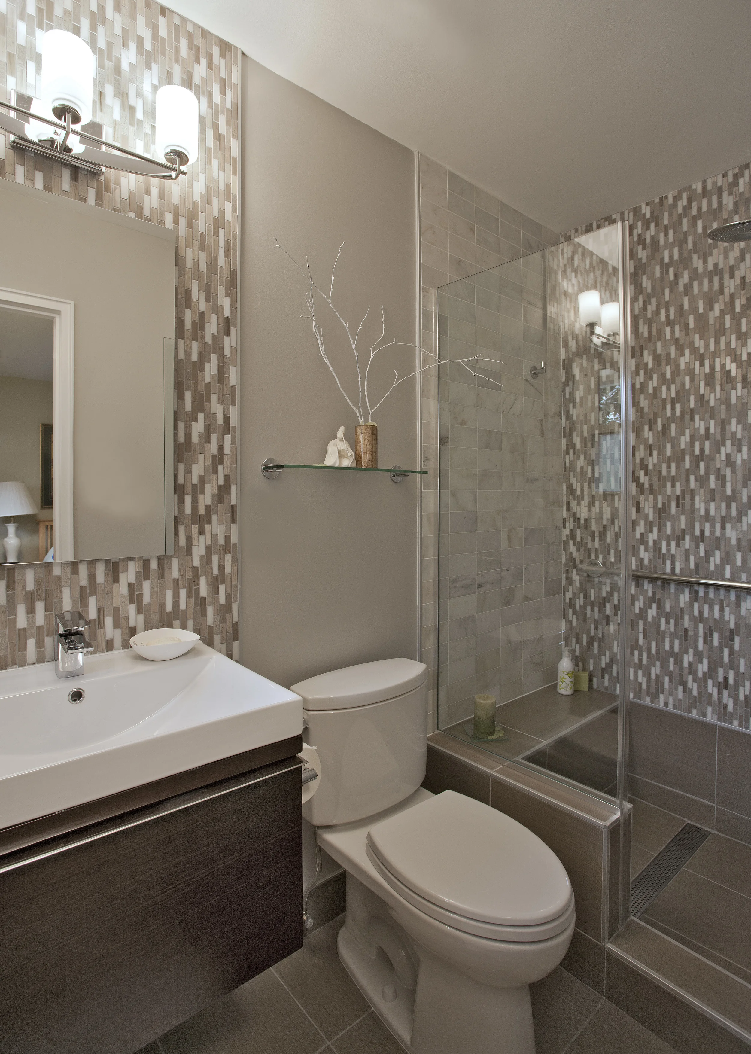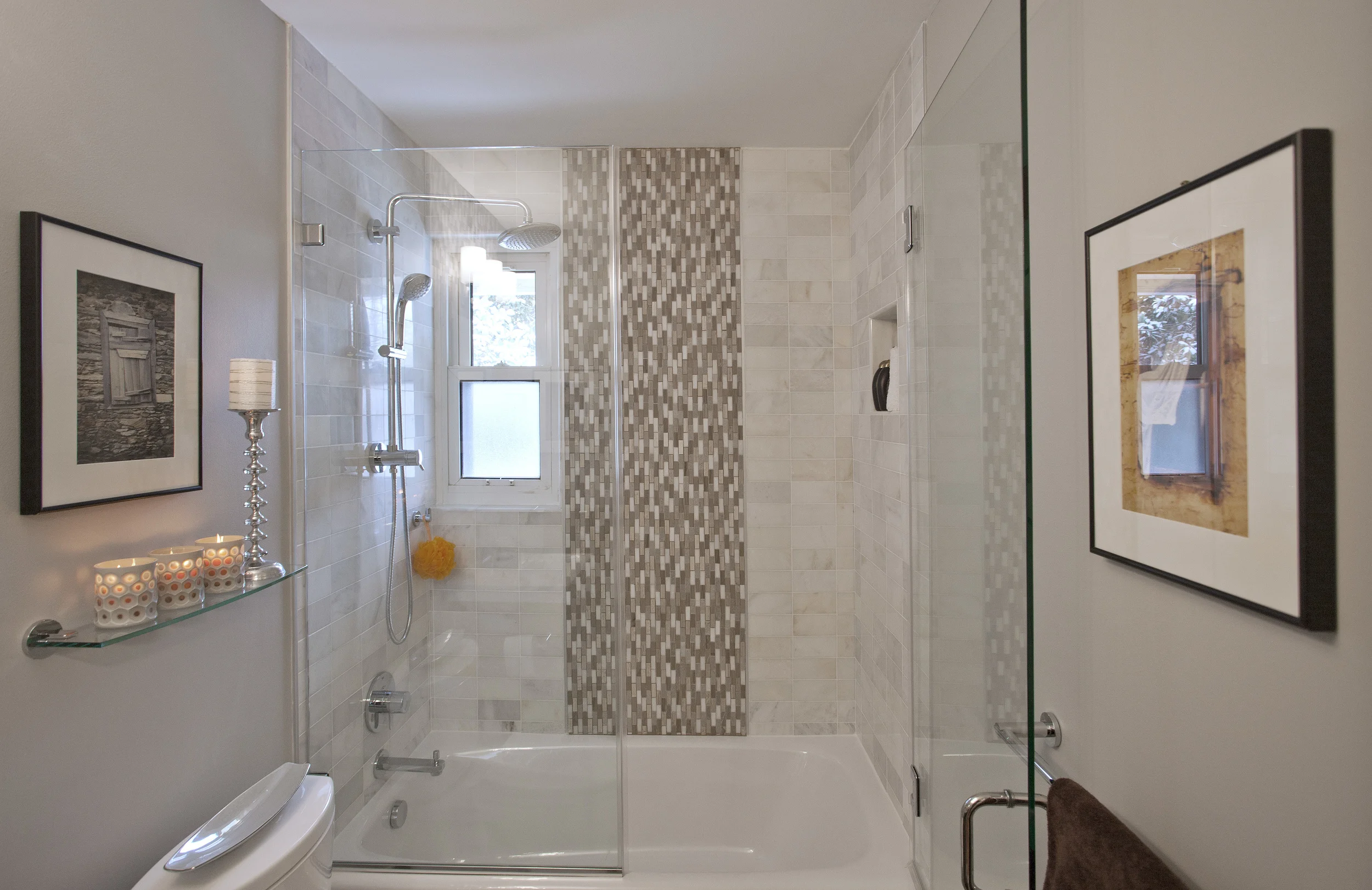 Clean lines, serene colors, wall-mounted lavatory and frameless shower and bath enclosures help these two bathrooms feel bigger, light, and airy.